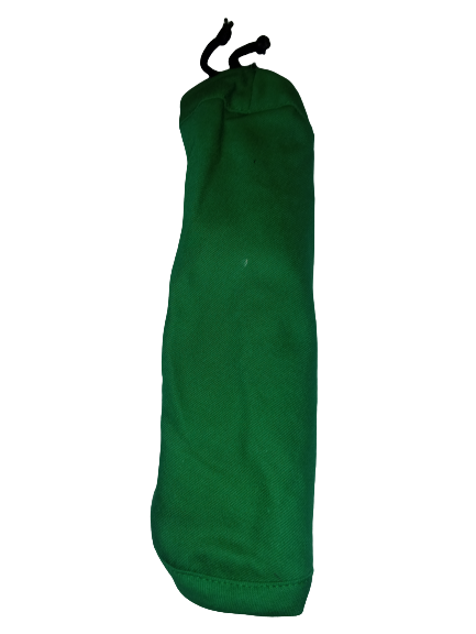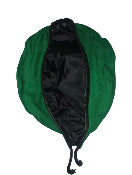 Boina de tela tejida , color Verde, con contorno de cuero, la misma se regulo a la medida requerida.